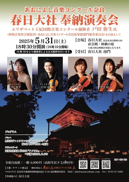 さらに、2025年5月31日(土)には世界遺産・春日大社にて奉納演奏会を開催予定。加えて、第12回を迎える「あおによし音楽コンクール奈良」も4月よりエントリー受付を開始し、奈良を舞台に“音楽でつながる”文化プログラムを多面的に展開してまいります。