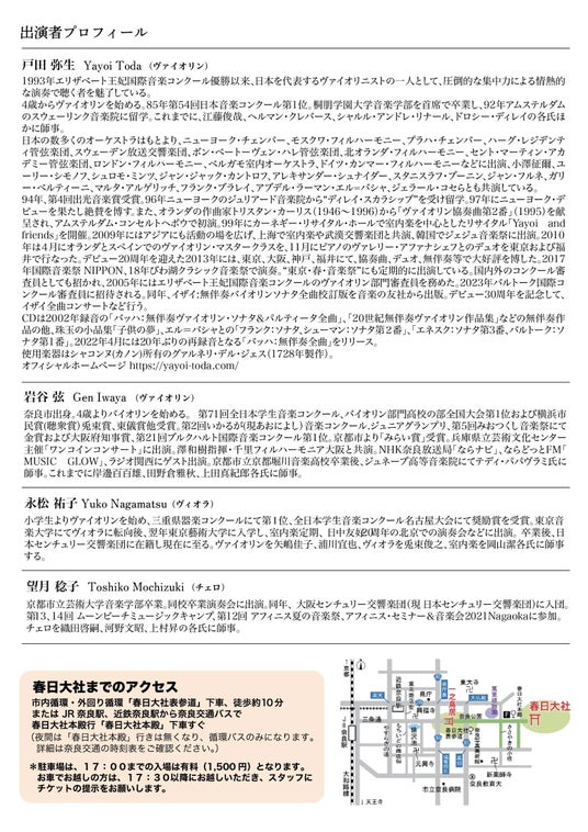 斑鳩音楽祭の開催に先立ち、2025年5月31日(土)には、世界遺産・春日大社(奈良市)にて奉納演奏会を開催いたします。神聖な空間に無伴奏ヴァイオリンと弦楽四重奏の音色が響く、特別な一夜となる本公演では、戸田弥生氏によるバッハと、戸田氏を中心に精鋭の演奏家たちがドヴォルザークの名曲を披露。静謐な自然と歴史に包まれた“直会殿“を舞台に、音楽が奉納されます。