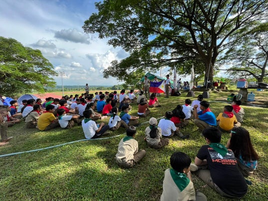 【写真:備えよ常に(Laging Handa)】「備えよ常に」を胸に。キャンプ初日の豪雨にも屈せず、笑顔で活動を続けるAPSEボーイスカウトのメンバーたち。