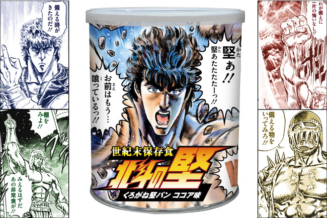 本品は中身に北九州名物で非常に硬くて有名な「くろがね堅パン」(株式会社スピナ)を使用し、ココア味のくろがね堅パンが5枚入り個包装で4袋入った缶入りの非常食です。個包装には北斗神拳伝承者候補のケンシロウ、ラオウ、トキ、ジャギの北斗四兄弟がそれぞれ備蓄について言及しており、また、缶にはケンシロウの力強い北斗百裂拳パッケージとすることで、どんなに困難で、世界が荒廃するような非常時であっても勇気、希望を得られる非常食です。