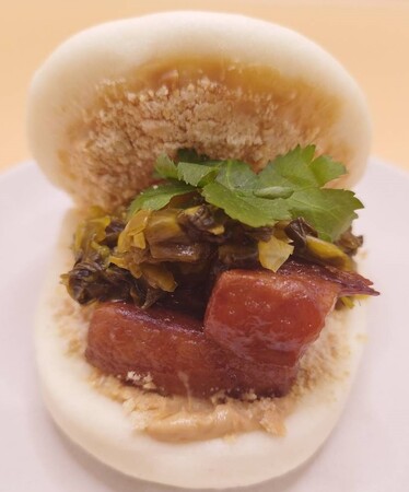 台湾風「豚の角煮」を中心に、もちっとしたバンズの中に「高菜」「ピーナッツの粉」などが入った台湾グルメの代表選手! 1個:680円(税込み)