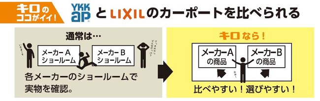 家電量販店で商品を選ぶときのように「異なるメーカーのカーポートを比較できること」をテーマに、YKKAPやLIXIL、三協アルミなどの大手メーカーのカーポートを一斉展示しています。