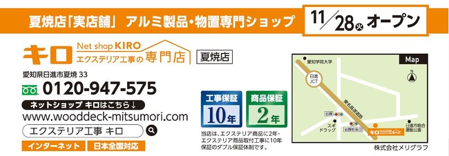 エクステリア商品の販売・施工・提案を行う株式会社誠和(本社:愛知県日進市、取締役社長:東輝太郎)は、2023年11月28日、日進市の本社内にリアル店舗&展示場「キロ夏焼店」をオープンいたしました。関連会社:株式会社メリグラフが運営するエクステリア工事サイト「キロ」(https://www.wooddeck-mitsumori.com/)のノウハウを元に、家電量販店のように、実物のカーポートを「比較」できるお店となっています。