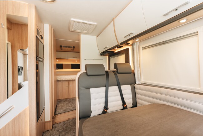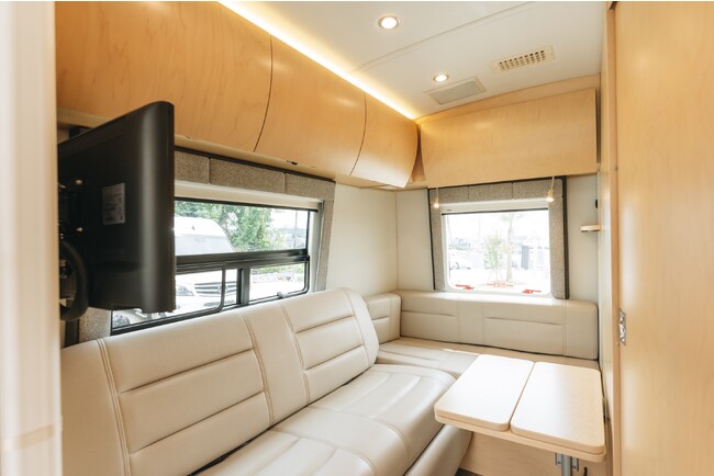 ドイツの老舗のキャンピングカーの作り手が製作したSunlightシリーズの数少ない特別車両。高級ホテルにいるかのようなアイランドベッド仕様になっているのが特徴の車種で、運転席助手席上部にプルダウンベッドが設置されているため、グループ利用にも最適。撮影のロケ待合室の利用にも使用できるなど、様々な用途でご利用できます。