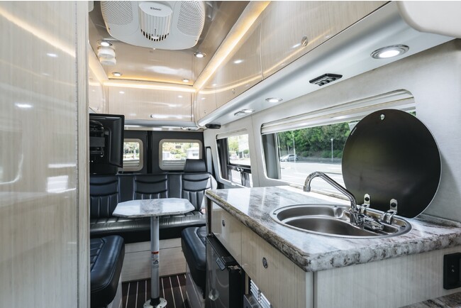 最高級ラウンジカーの「INTERSTATE」は、米国の老舗トラベルトレーラーメーカーであるエアストリームが内装を手がけた車種。メルセデスベンツの滑らかでパワフルな走行と剛性の高いシャーシによって移動時の静粛性を保ちながら、車内で快適に過ごせる。くるま旅・お客様の送迎にも幅広く使用できます。