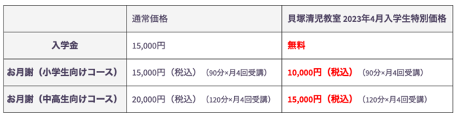 2.:レッスン料通常15,000円(税金込)(90分×月4回)のところ、10,000円(税金込)(90分×月4回)(小学生コース)