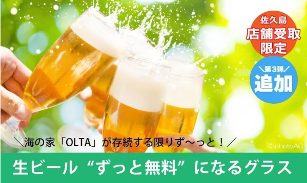 海の家「OLTA(オルタ)」で、生ビールがずっと無料で注文できる「OLTA」ロゴ入りオリジナルグラスです。『お友達や従業員、いつもお世話になっている人たちに注文できる!』5つセットも追加されます。【海の家リアルお店屋さんごっこ】