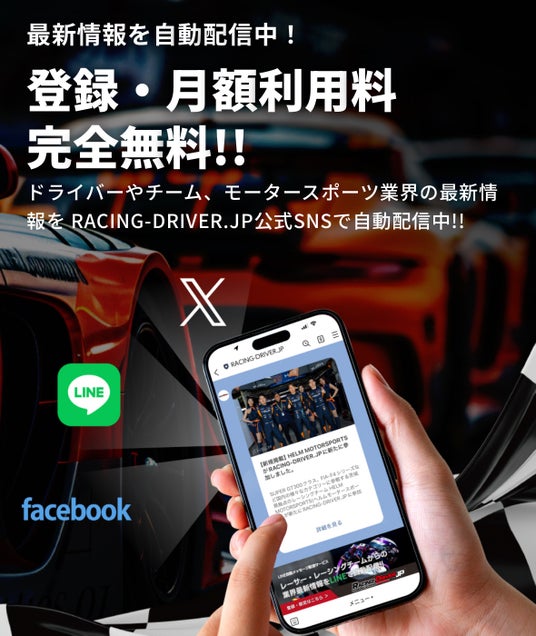 LINE公式アカウントやオフィシャルX、Facebookページで業界情報を完全無料で配信中!!ドライバー・チームが発信するブログはRACING-DRIVER.JPでの掲載に留まらず、LINE公式アカウントやオフィシャルX、Facebookページでも自動配信中。モータースポーツを愛するファンの方に業界の最新情報をいち早くお届けしています。(自動配信サービスの利用は完全無料)