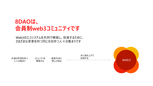 香港やアジアを拠点とするWeb3コミュニティ「8DAO」は、Web3 エコシステムを共同で構築し、投資する、さまざまなバックグラウンドを持った志を同じくする人々による会員制の Web3 コミュニティです。Web3の未来に焦点を当て、Web3プロジェクトに投資・支援を行い、Web3愛好家と意見を交わし合いながら交流を深め活動します。8DAOでは共にコミュニティの活動を推進するメンバーを常時募集しています。