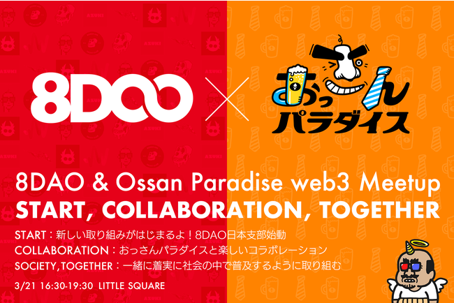 )が主宰するNFTプロジェクト「おっさんパラダイス」との合同ミートアップを3月21日(火・祝)に開催いたします。 8DAOについてのご紹介や、今回の日本支部発足について、おっさんパラダイスとの取り組み、今後の展開などをテーマに8DAO日本支部メンバーでのトークセッションを行います。NFTプロジェクト「おっさんパラダイス」は、NFTのPFPコレクションを展開し、Web3領域が着実に社会普及することに取り組む実証実験プロジェクトです。今回のミートアップでは、QRひとつでNFTの所有を認証できるソリューション『NFTauth』(https://twitter.com/0xNFTauth