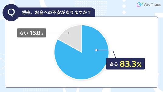 「将来、お金への不安がありますか?」という設問、83.3%の若者が「お金の不安がある」と回答し、将来のお金に対する不安が大きいことが分かります。