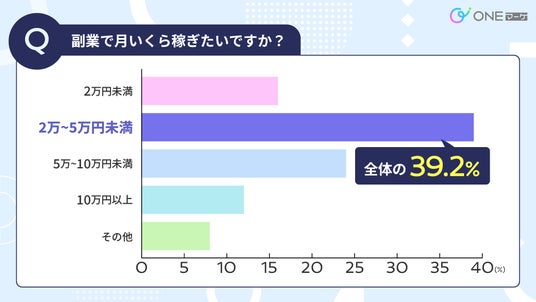 最も多かった回答は全体の39.2%が「2万~5万円未満」と回答。同時に本業以上の収入が目指せる副業も求められている