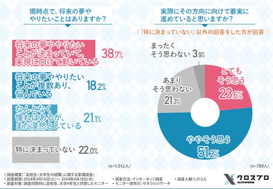 将来の夢ややりたいことが決まっていて、現実に向けて動いている方が約4割いることが明らかになりました。一方で、現時点では悩んでいたり、漠然としている方も約4割いるようです。