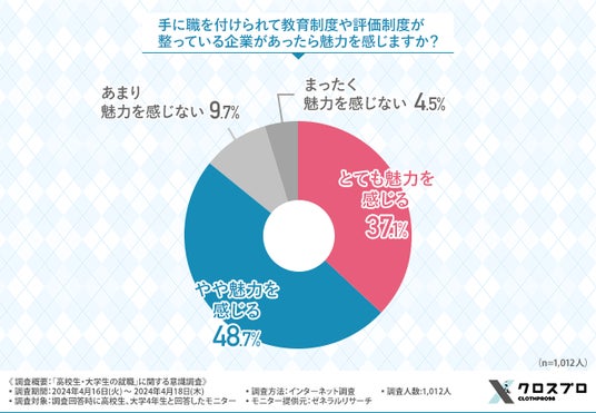 続いて、「手に職を付けられて教育制度や評価制度が整っている企業があったら魅力を感じますか?」と質問したところ、8割以上の方が『とても魅力を感じる(37.1%)』『やや魅力を感じる(48.7%)』と回答しました。