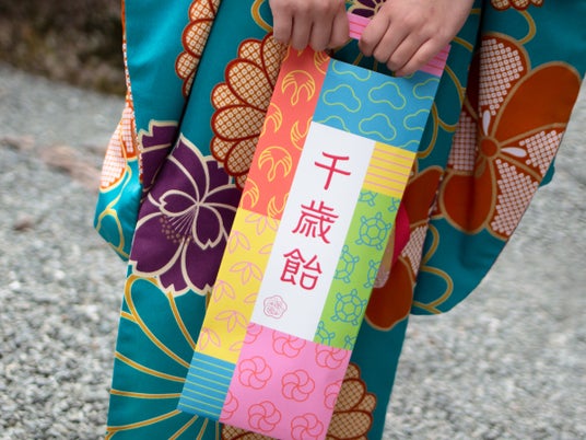 千歳飴の袋は昔ながらの柄から松竹梅と鶴亀というモチーフを抽出し、ハレの日の装いに彩りを添えるデザインへと昇華しました。