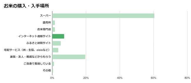 お米の購入・入手先としては「スーパー」が大半を占め、全体の6割以上になりました。また、次点が「家族・友人・親戚などからもらう」で、身近な場所で入手することが多いようです。一方で「インターネット通販サイト」は7%であり、まだまだ利用者が少ないことがわかりました。