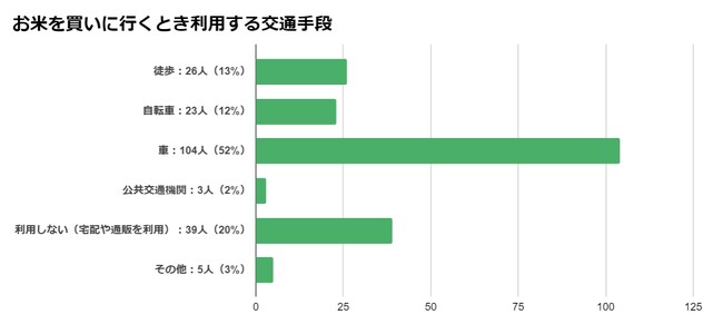お米を買いに行く際の交通手段について質問したところ、「車」という回答が104人で全体の半分以上(52%)。次に多かったのが「宅配や通販を利用するので、交通手段は利用しない」で39人(20%)で、お米を買う上ではお米の重さが大きなネックとなることがわかりました。