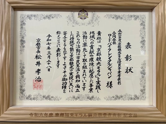 2024年度には、観光モラルを守る優れた取り組みを行う企業として、京都市より「京都観光モラル優良事業者」に表彰されました。私たちは単なる自転車レンタル業だけに留まらず、自転車を通じて「地域と深くつながる旅」を提案します。