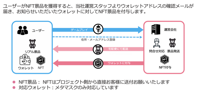 これにより、月間5万人が利用するクレーンゲーム内で、NFTを獲得することが可能になります。ユーザーがオンラインクレーンゲームによってNFT景品を獲得すると、ウォレットアドレスの確認メールが届き、登録されているウォレットに対してNFT景品を付与する仕組みです。
