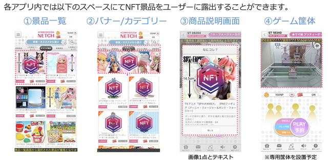 今回サービスを提供する「ネッチ」では、すでに人気のアニメグッズの他にも、ファミリーが好む食品や日用雑貨、コスメなど約4,000種類の景品が用意されていますが、さらに、NFT景品の取り扱いを開始します。