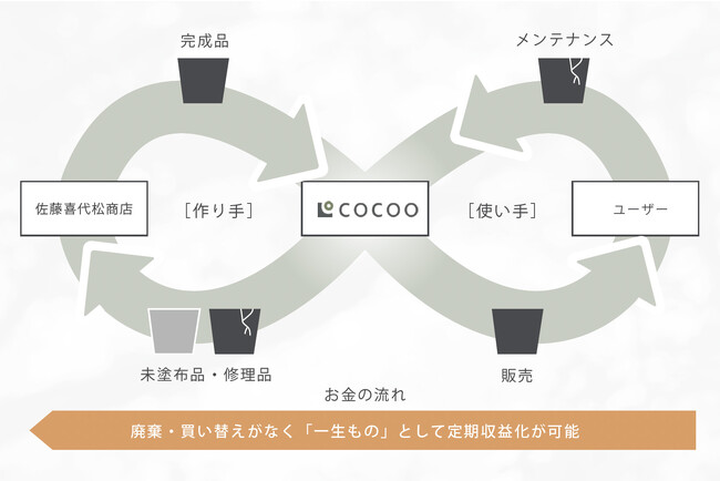 漆の国内需要は、石油化学の発展やライフスタイルの変化により減少し、現在の消費量は約100年前のピーク時から99%減の約26トンに(2022年値)。同時に後継者不足により漆職人の数も減少し、産業は衰退の一途をたどっています。COCOOは共創パートナーと連携しながら、漆タンブラーの中量生産・販売に加え、新たに「メンテナンス」という事業を創出することで、漆産業の雇用を生み出していきます。
