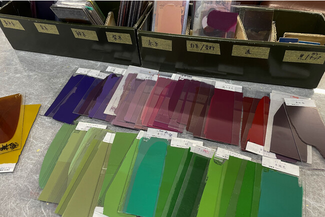 佐藤喜代松商店の先進的な漆の特徴の一つが、発色の良い色漆とそのカラーバリエーションです。その色の種類は業界内では類を見ない100色以上にものぼります。色漆が発展した背景には、豊かな色彩が特徴の「西陣織」の用途がルーツで、なかでも粋を極めた特別な高級帯をつくるために色漆が使われていたとか。生み出される色の中には、佐藤喜代松商店にしか出せないものもあり、微細な色彩表現にこだわる人間国宝の漆芸家に重宝されるほど。