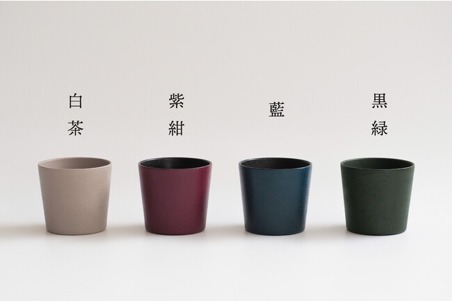 このたび発売する「真空漆 KISSUL」色漆シリーズは、共同開発する京都の老舗漆屋「佐藤喜代松商店」の独自の漆の調色技術と、漆の「焼き付け技法」の応用により生まれました。佐藤喜代松商店は、全国でも類を見ないほど多彩な色漆(いろうるし)を得意とし、取り揃える色漆の数はなんと100色以上。その色見本の中から 「白茶(しらちゃ)、紫紺(しこん)、藍(あい)、黒緑(くろみどり)」の4色の伝統色を厳選しました。華やかさもありながら主張しすぎない 焼き付け技法ならではの深みのある色味が、和洋どちらの空間にも調和します。漆タンブラーの独特の質感と合わせてお楽しみください。