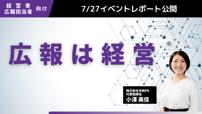 「PRで世界を変える」をミッションに掲げる株式会社令和PR(本社:東京都世田谷区、代表取締役 :小澤美佳)は7月27日(木)に、「広報は経営」と題したオンラインセミナーを開催いたしました。81名が視聴し、参加者満足度は100%となりました。今回セミナーレポートとして当日の様子やアンケート結果をお届けします。