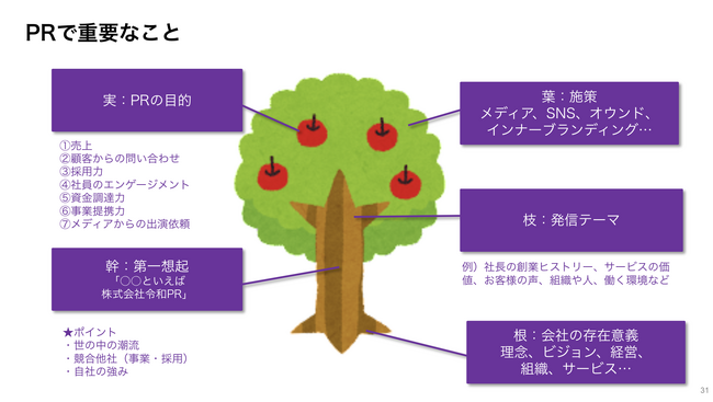 枝葉の施策ではなく会社の理念や存在意義となる根の部分、そして「~といえば令和PR」のように世の中に想起される自社の強みである幹がPRにとって重要であることに触れ、それらを経営者としっかり時間をつくりヒアリングすることを解説しました。