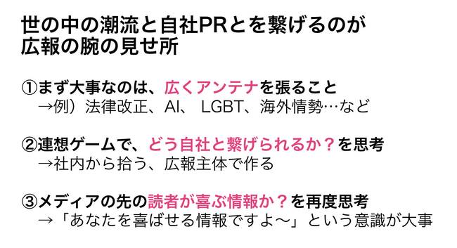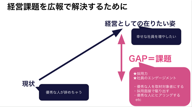 また、経営課題を広報で解決するためには、現状と経営者としてのありたい理想像とのGAPを見出し、それを広報施策に落とし込んでいくべきだと解説しました。