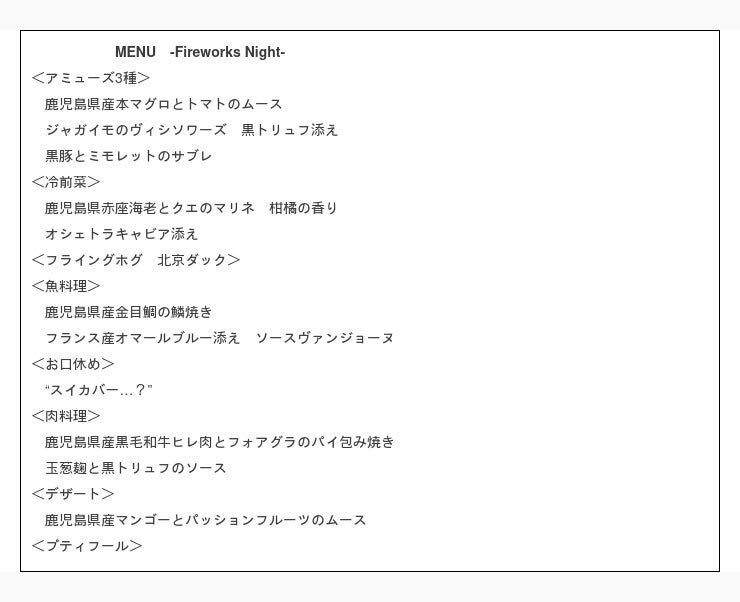 この日限りの特別なディナーコースは、金目鯛を皮はカリッと身はふっくら焼き上げた魚料理や、お祭りのヨーヨーを表現した夏らしいトロピカルな味わいのデザートなど、見た目も華やかなこの季節ならではのメニューです。錦江湾や桜島を望む唯一無二の絶景とともにお楽しみください。