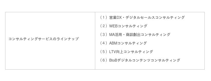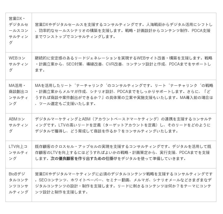 上記のラインナップを主力コンサルティングメニューと位置付け、BtoB企業のデジタル活用を支援いたします。