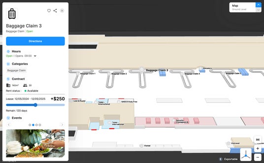 空港ではフライトプランと連携して、乗り換え案内やトランジット時の空港内の施設についても確認ができ案内にかかる工数や、マップやサイト情報の更新にかかる工数を大幅に削減可能。