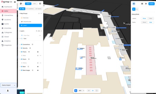 CAD 図面やPDFデータ、画像データから 3D マップ化、リアルタイム CMS 更新、利用分析ダッシュボードまでワンストップ――展示会・商業施設・病院・空港など多彩な業種で導入可能