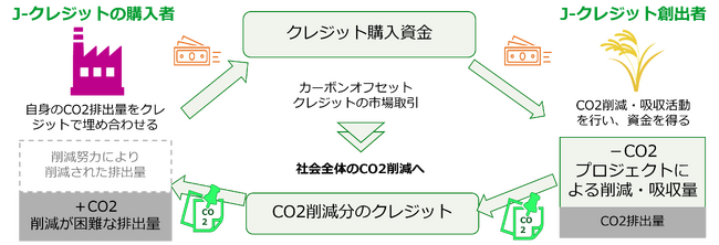J-クレジット制度とは、温室効果ガスの排出削減量や吸収量を「クレジット」として国が認証する制度です。J-クレジット創出者はクレジットの売却によって経済的な利益を得ることで、削減・吸収活動の資金に充てることができます。