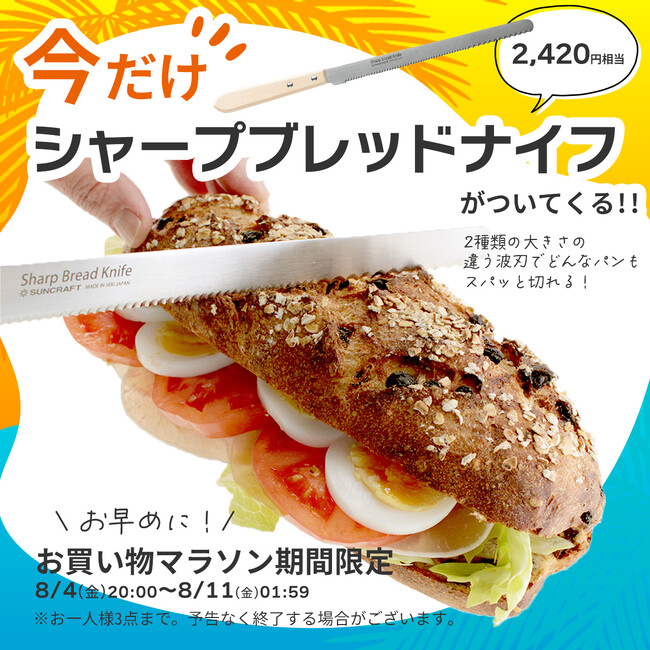 キャンペーン実施期間に「暮らし HALEYS<ハレイズ>楽天市場店」にて「バゲットサンドメーカー」を購入するだけで、なんと2420円相当の「サンクラフト シャープブレッドナイフ」をもれなくプレゼント。