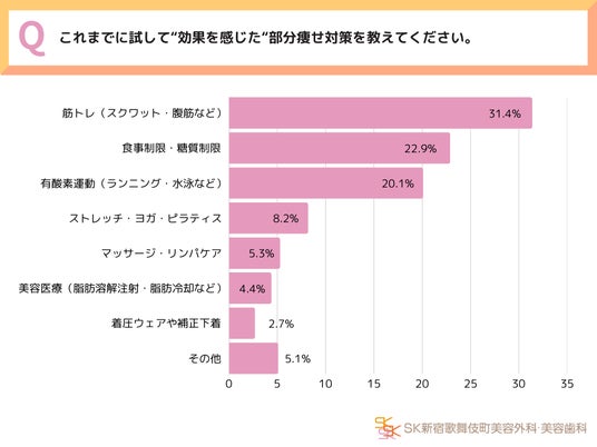 - 部分痩せで最も効果を感じた方法は「筋トレ(スクワット・腹筋など)」(31.4%)