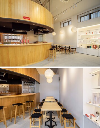 「クリンスイハウス」内には、機能性とデザイン性に優れたコントラスト家具の製造を手掛けるFLACEによる家具が並んでいます。ヒノキ材の天板を用いたテーブルには、表面仕上げに塗料「バイオペイント 」が用いられました。