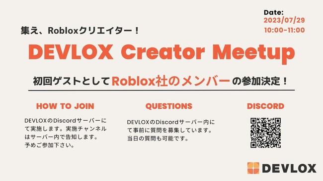 Robloxのクリエイター支援事業を展開する株式会社DEVLOX(本社:東京都新宿区、代表取締役:田中公彦、以下当社)が、Robloxクリエイター向け交流イベント「DEVLOX Creator Meetup」を開催いたします。初回の開催日程は7月29日を予定しており、初回ゲストとしてRoblox社の社員にご参加いただくことが決定いたしました。