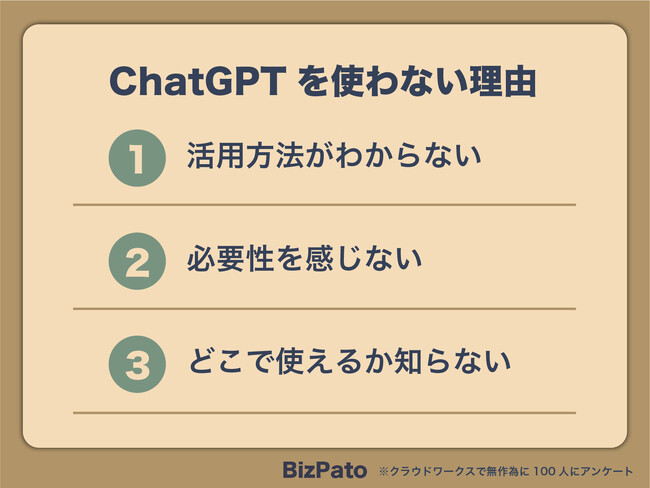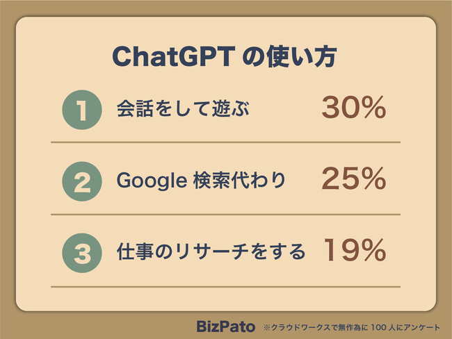 株式会社BizPato(本社:東京都町田市玉川学園8丁目20番4号 シャルル玉川101 代表取締役:高橋拓真)はChatGPTの使い方について調査いたしました。