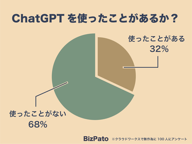 「ChatGPTを今まで一度でも使用したことがありますか?」という質問に対して、68%の人が「使ったことがない」と回答。このことから、まだまだ日常生活の中に浸透しているとは言いにくい現状です。