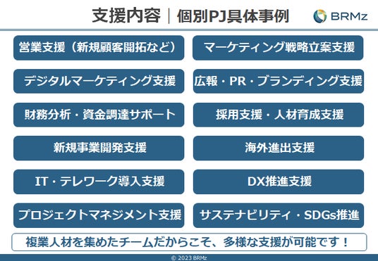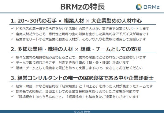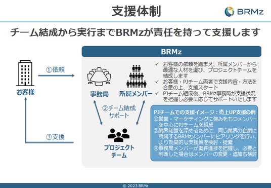 BRMz合同会社(本社:東京都渋谷区、代表社員:川村匡弥、以下BRMz)は、「BRMzコミュニティ」に所属する若手複業人材でチームを組み企業の経営課題解決を支援しております。今回は支援テーマのひとつとして「経営理念・行動指針策定」をピックアップし、ご支援企業様のインタビュー記事をホームページに公開いたしました。複業人材を活用いただいた企業様の生の声を紹介するもので、これはBRMzとして初の試みです。