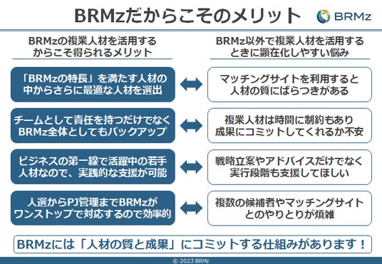 BRMzも法人設立2年目を迎え、大企業の若手複業人材を中心にコミュニティメンバーも70名超となりました。支援事例も20件を超えるなど、複業人材活用のニーズも顕在化しております。今後も、多様な業種・職種の複業人材が集まるBRMzだからこそできる広く深い支援を着実に進めてまいります。