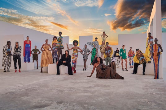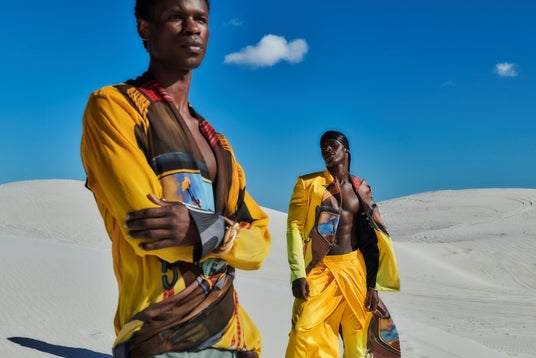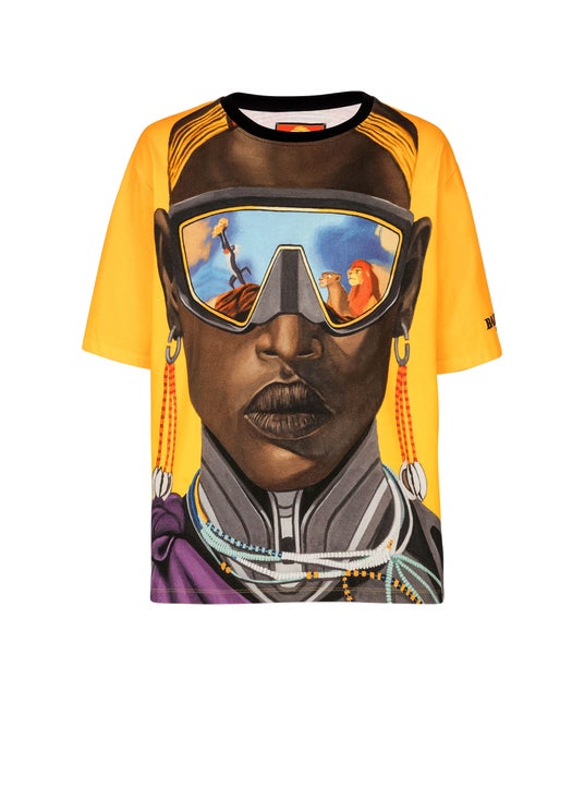 南アフリカの画家ニカ・ムトワナは、コレクションのために印象的なアフロフューチャリスティックなポートレートを作成しました。彼は被写体のサングラスのレンズに映る「ライオン・キング」のワンシーンを巧みに作品に取り入れました。ルスタンは、ムトワナのデザインをカラフルなプリントに変えて、限定版コレクションのTシャツ、トップス、ドレスに採用しました。