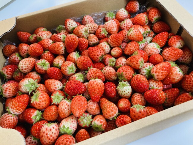 ブランド苺「ヒルズいちご」を生産するいちご生産者、株式会社山元ヒルズファーム(代表取締役:小林幸男 宮城県亘理郡山元町)は、取引先の基準に合わない、小さすぎて廃棄されていたいちご1Kg(約200粒~250粒)を『お腹いっぱいいちご』として2023年1月より山元町農水産物直売所「やまもと夢いちごの郷」で販売開始いたしました。いちご生産の現場では、商品として出荷できないいちご(1粒4~5g程度)が一定数発生します。当社のようにブランドいちごを生産する農家は、出荷の品質基準が一般的な基準に比べてかなり高く(1粒平均12g~25g程度)、収穫から選別の過程で細心の注意を払っても一定数のロスが生まれます。このようないちごは、食べられる状態であっても廃棄されたり、加工業者に1Kgあたり100円程度で買取されています。