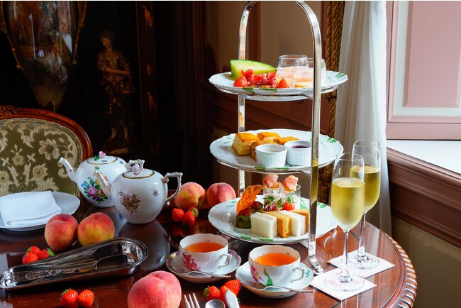 長楽館(京都市指定有形文化財)内のデザートカフェ長楽館にて、「サマーフルーツアフタヌーンティー第2弾 桃&ベリー」を2023年7月15日(土)~8月20日(日)まで開催。白桃やフランボワーズ等のベリーを使用したスイーツ、白桃や夏野菜を使用したセイボリーなど、季節のアフタヌーンティーを提供します。食前酒には「ドン・ペリニヨン」をはじめとしたシャンパンもオプション料金で選択可能。