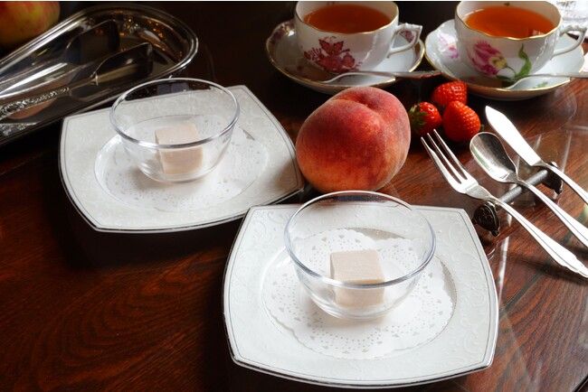 デザートカフェ長楽館では、アフタヌーンティーセットの最後にお愉しみの一皿をご用意しています。内容は時期によって変更となり、サマーフルーツアフタヌーンティー第2弾「桃&ベリー」の期間中は、キューブ型の「白桃ソルベ」をご用意いたします。
