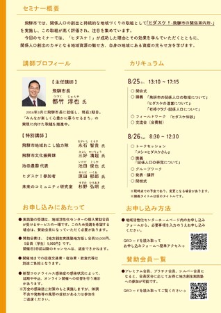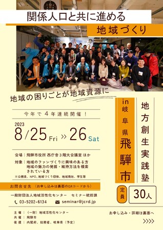 岐阜県飛騨市と一般財団法人 地域活性化センターは、全国各地の自治体職員や地域おこし協力隊など地域づくりに興味のある方を対象とした「地方創生実践塾 in 岐阜県飛騨市」を8月25日(金)~26日(土)に開催します。