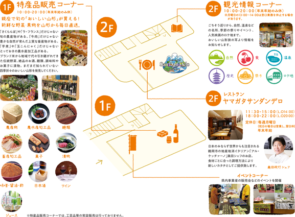 銀座に誕生した、山形県の“おいしい”をいっぱい詰め込んだアンテナショップです。 山形への観光の案内を行うほか、山形の農産物・特産品の販売や山形の旬の食材による料理の提供を行います。