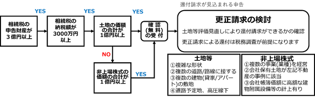 相談受付後の私どもの確認により、土地等評価見直しによる還付請求が見込まれる申告については、当社専門家が責任を持って還付請求手続き及び税務当局への説明・交渉を行います。なお、土地等以外の相続財産評価額等の相続申告内容が適正であることを前提にしており、これらの内容に問題がある場合には納税が生じる場合があります。